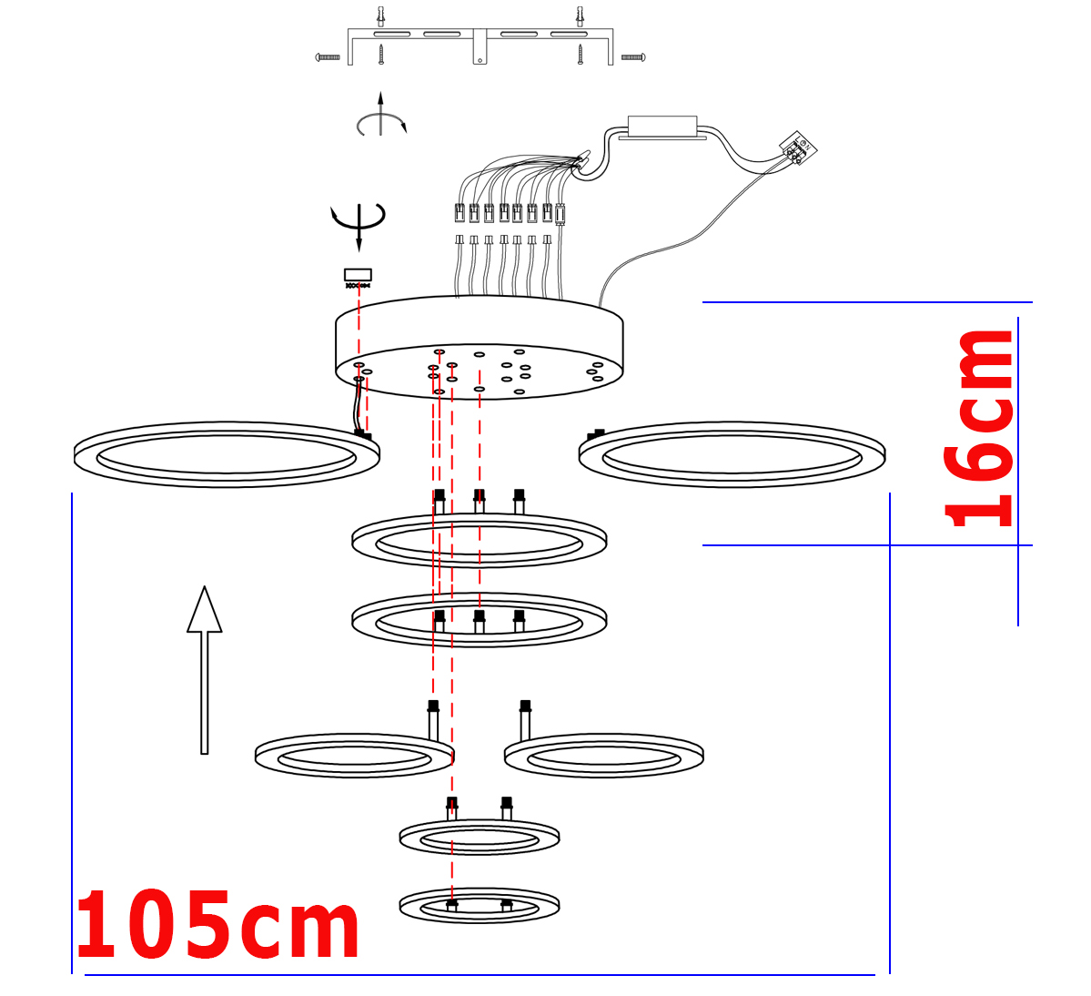 Lampa jest dość duża, ma długość 105 cm. Oświetlenie pochodzi z zewnątrz pierścieni.