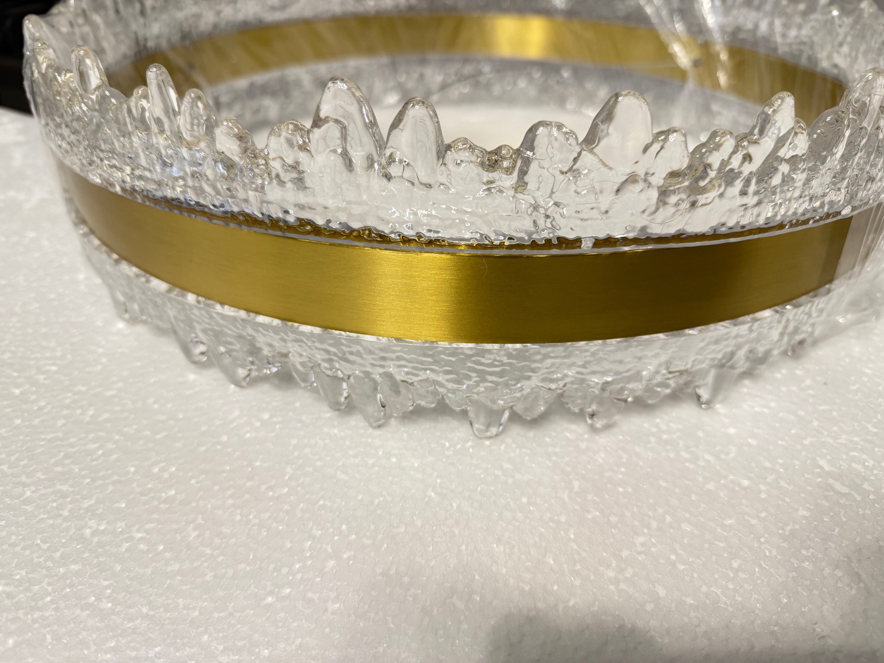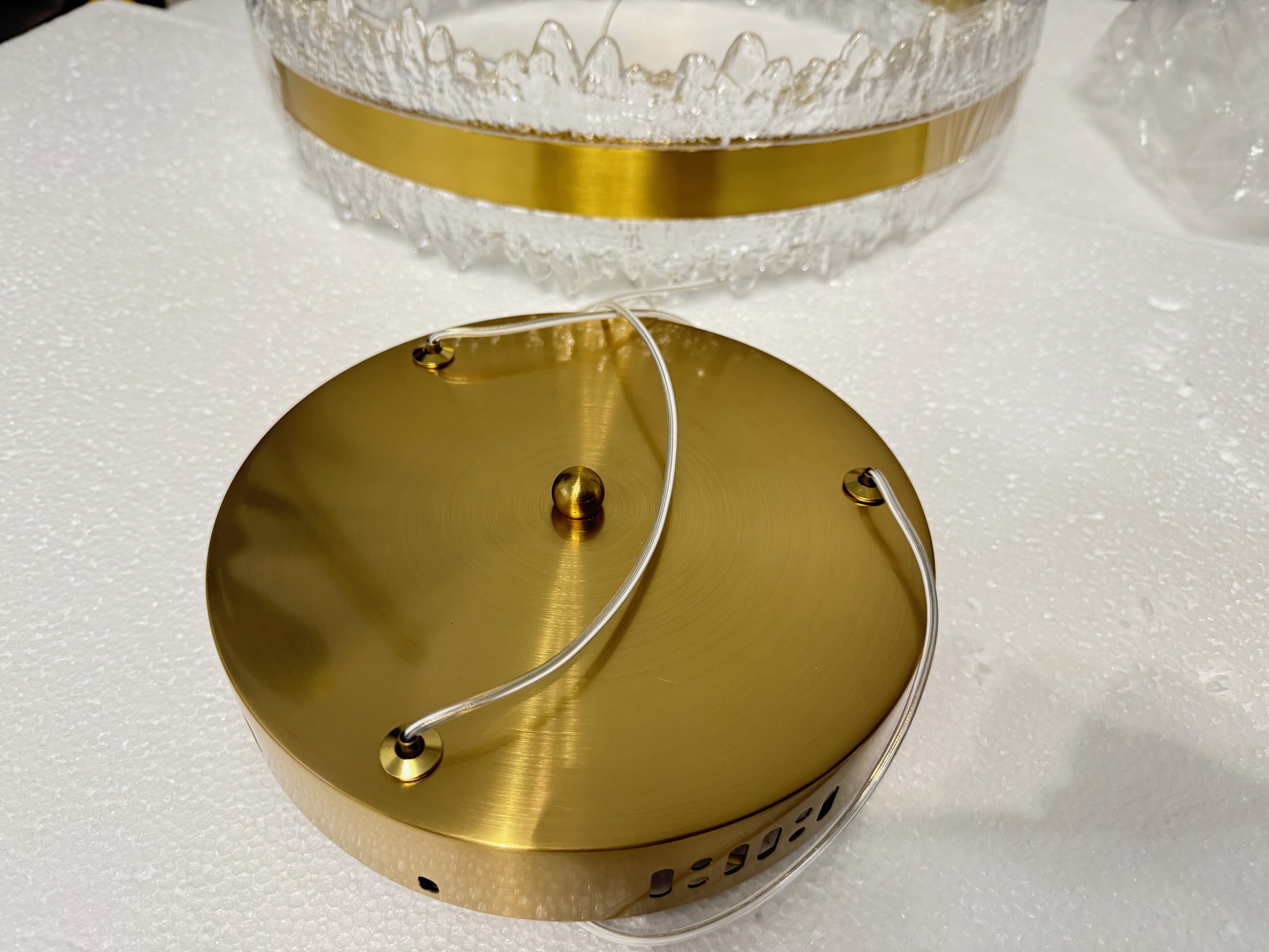 Pierścień został wykonany z wysokiej jakości metalu w kolorze złota, uzupełnionego o akrylowy klosz o strukturze kryształu. Dzięki temu lampa nie tylko pięknie wygląda, ale także wyjątkowo rozprasza światło, tworząc nastrojowe refleksy.