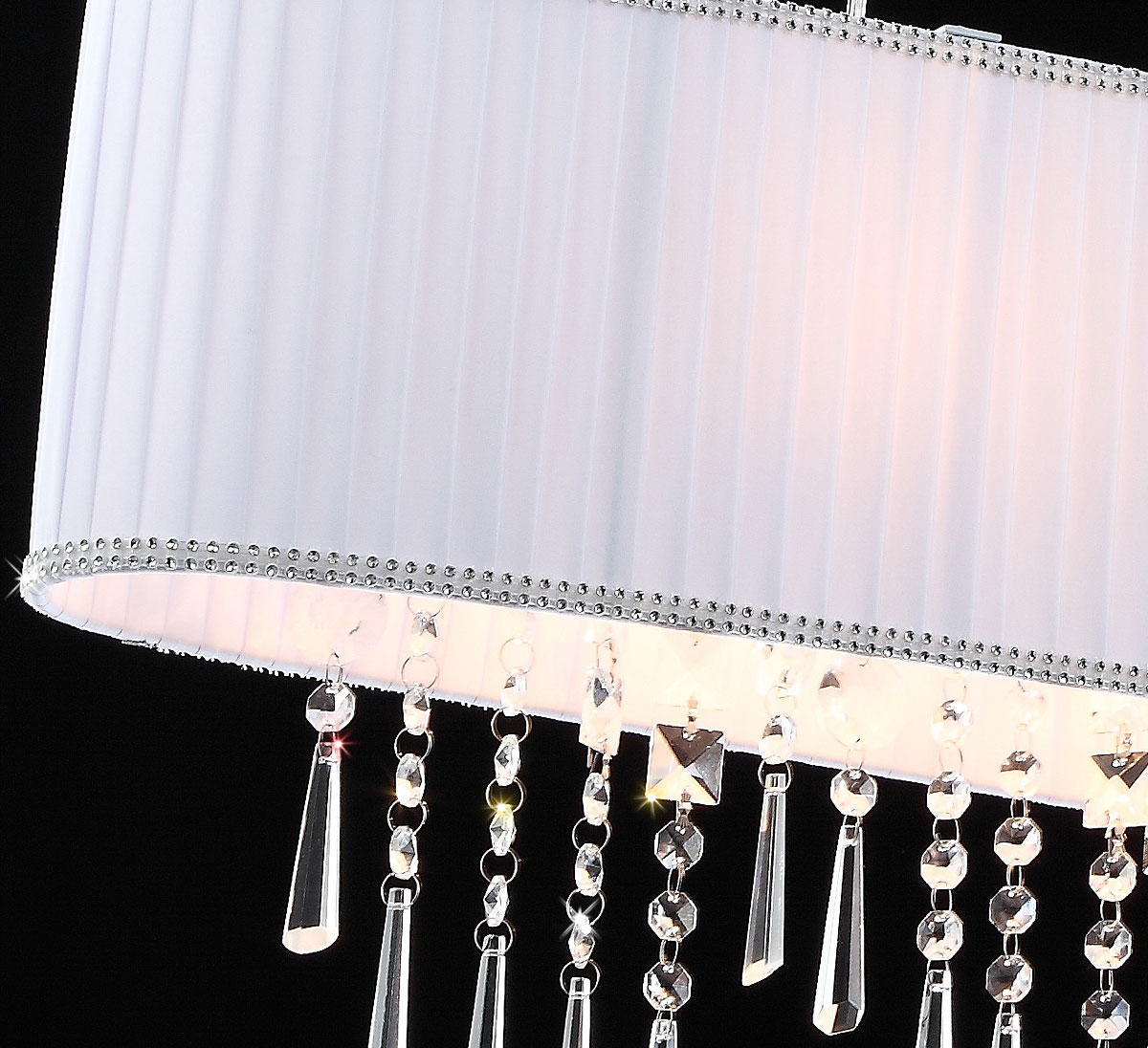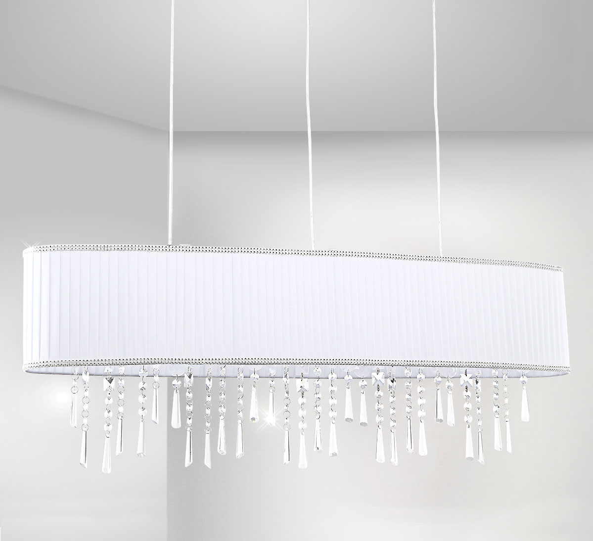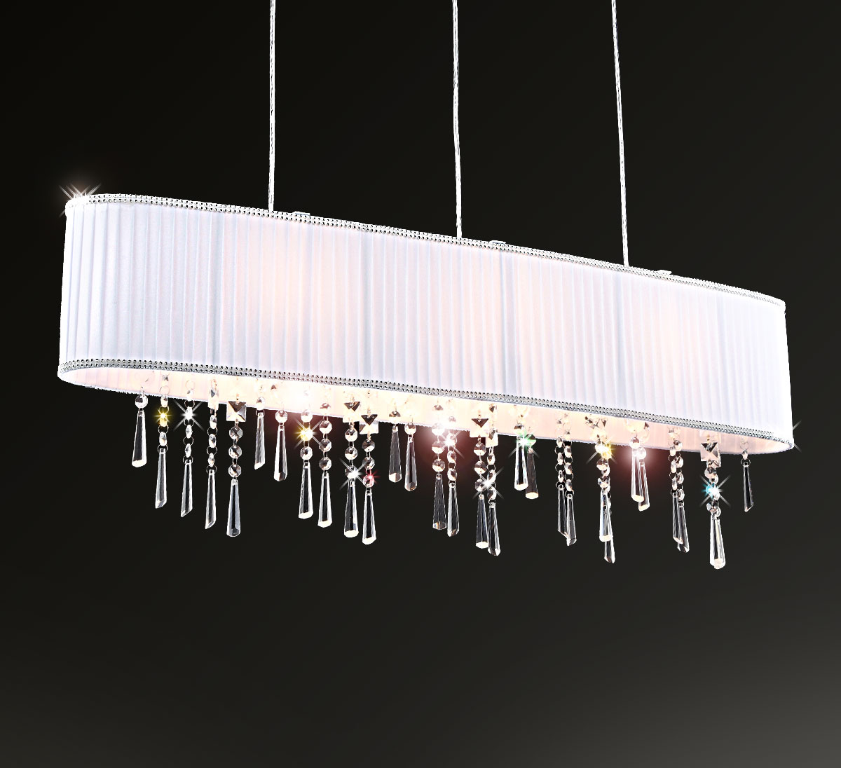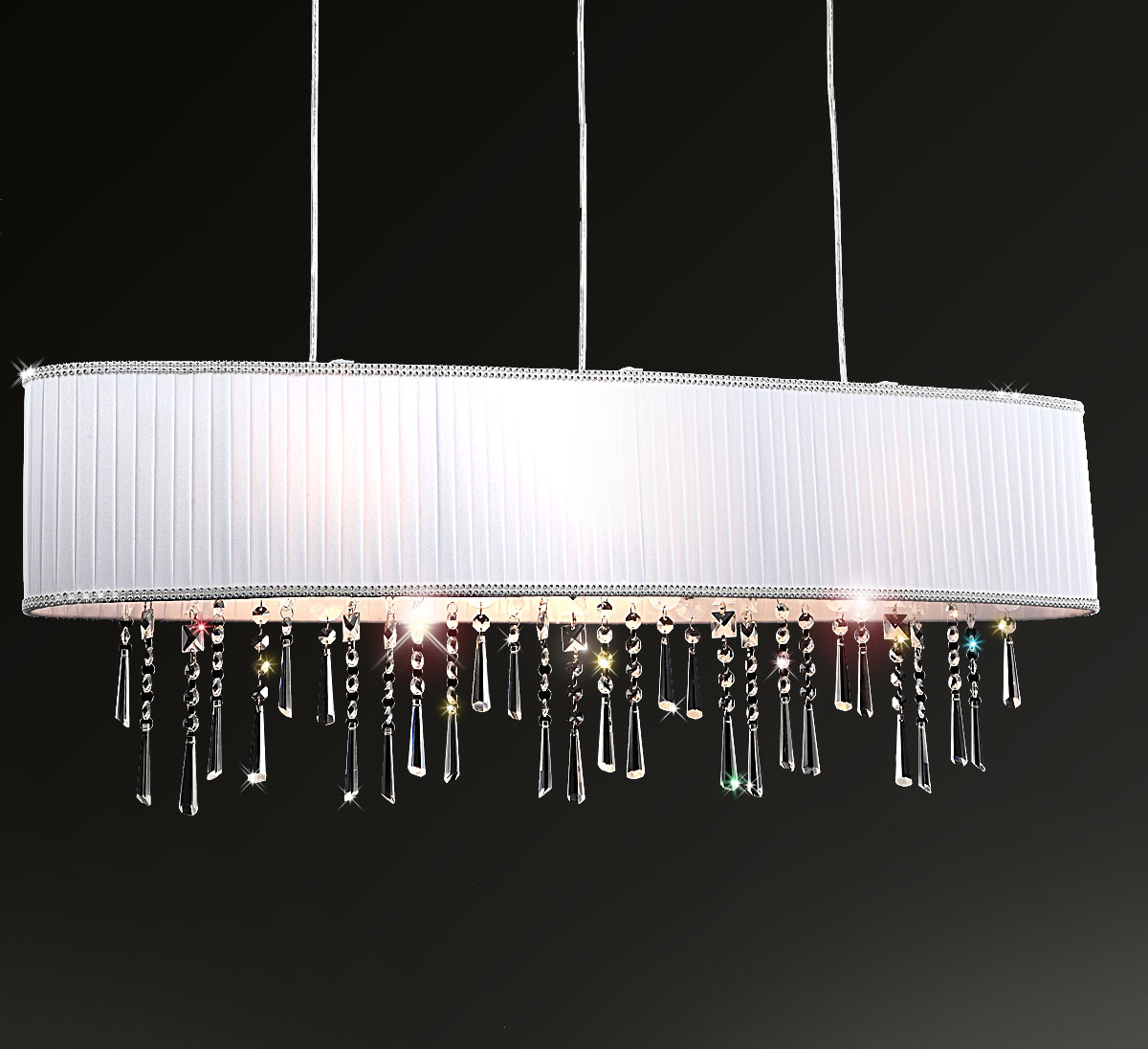 Modna biała tkanina tego wiszącego żyrandola kryształowego nadaje się uniwersalnie do każdego stylu wyposażenia i otoczenia kolorystycznego, a także zapewnia kontrast w stosunku do ciemniejszych tkanin, które zwiększają natężenie światła.