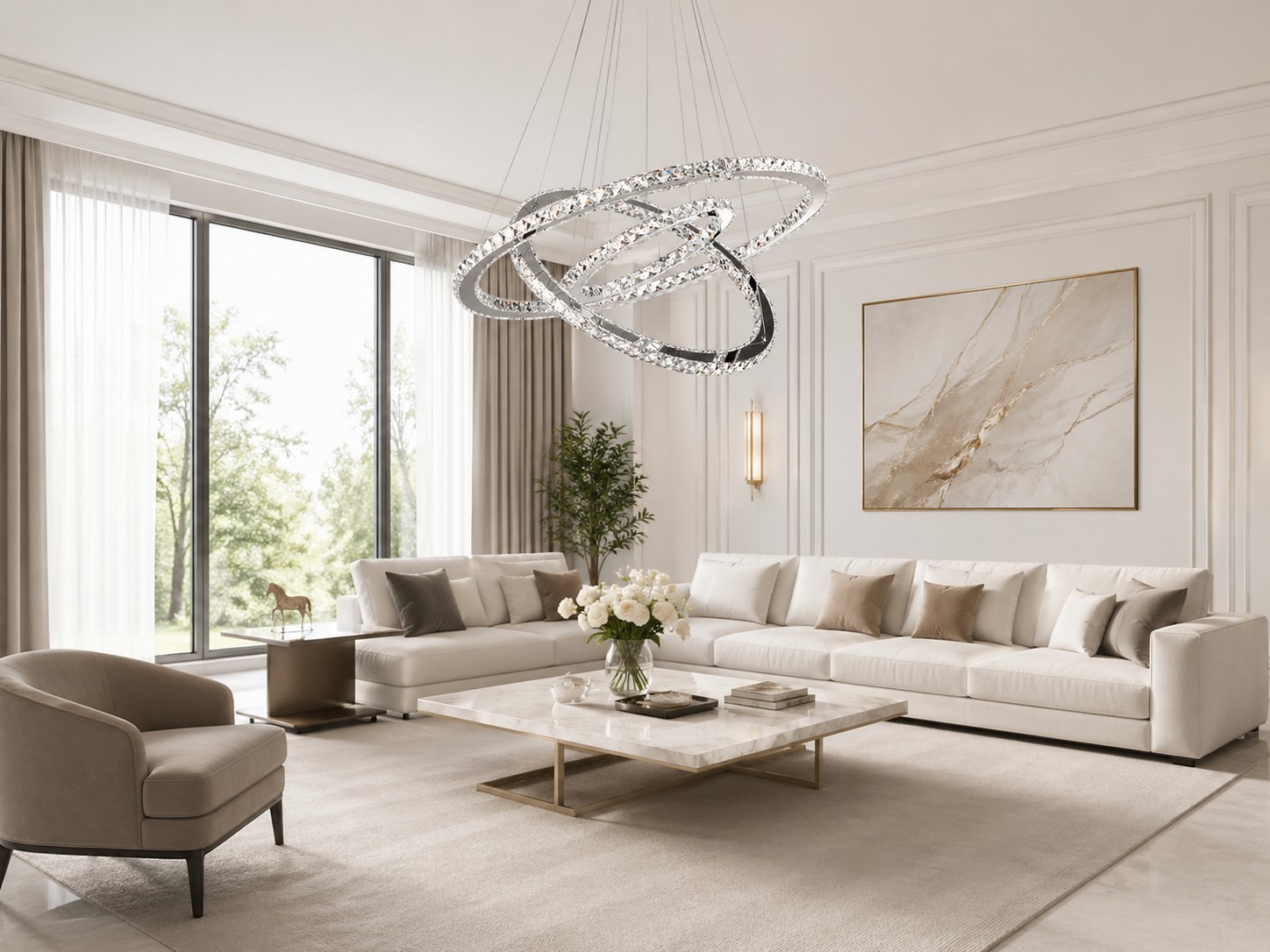 Model K009 dobrze sprawdzi się w salonie, jadalni, holu, sypialni lub pokoju dziennym. Trzy pierścienie z kryształami tworzą przestrzenną kompozycję, która pasuje do wnętrz nowoczesnych, glamour i eleganckich.